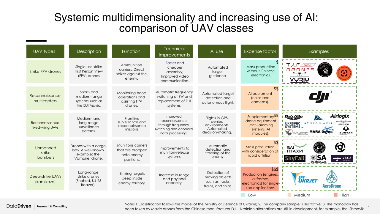 Based on the classification of the Ministry of Defence of Ukraine, drones are divided into strike FPV drones, reconnaissance multicopters, reconnaissance fixed-wing drones, unmanned strike bombers, and deep-strike UAVs.