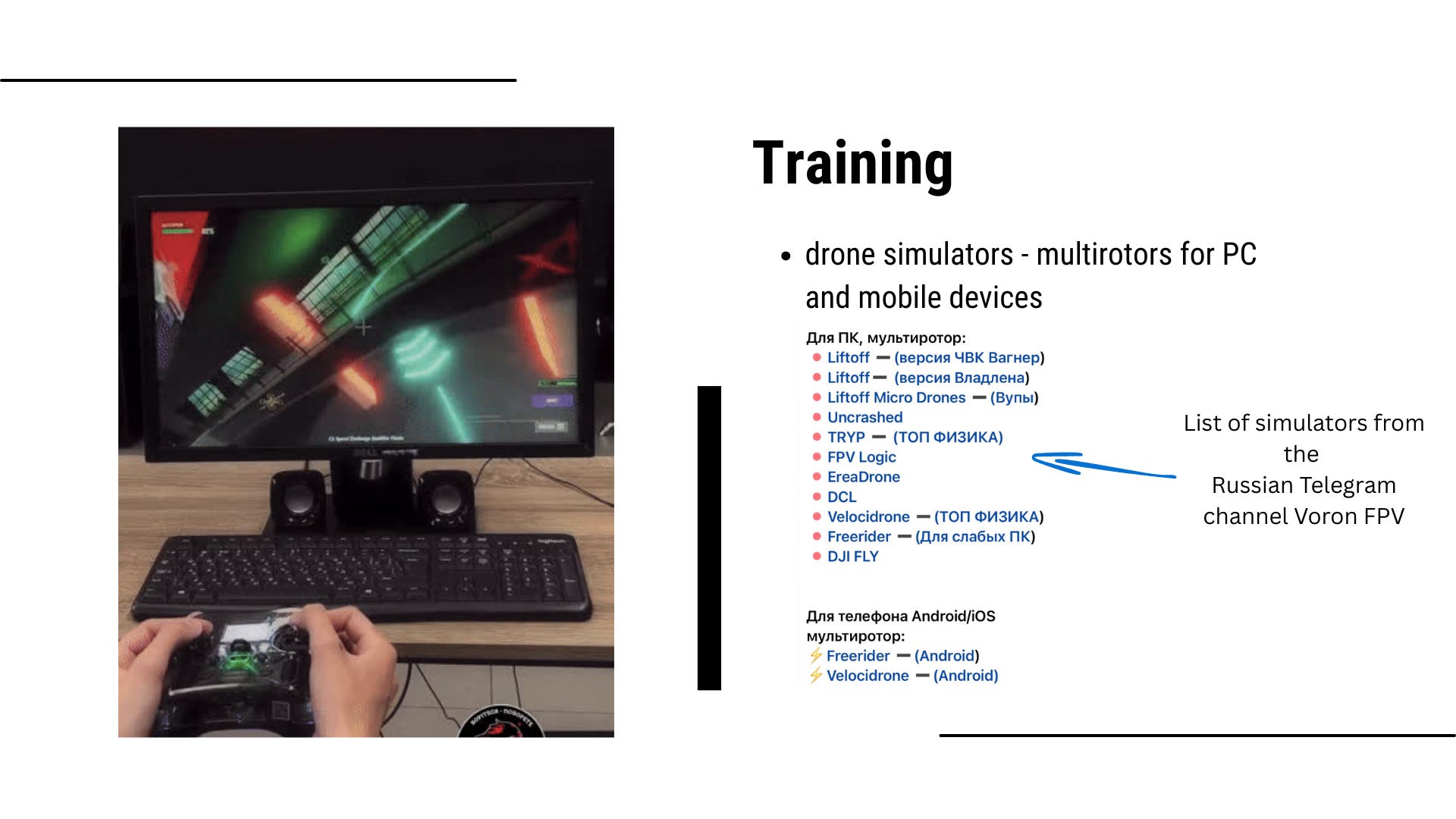 Training can now begin at home using a personal computer or even a mobile device, supported by highly realistic simulators such as Liftoff, the DRL Simulator, and VelociDrone.
